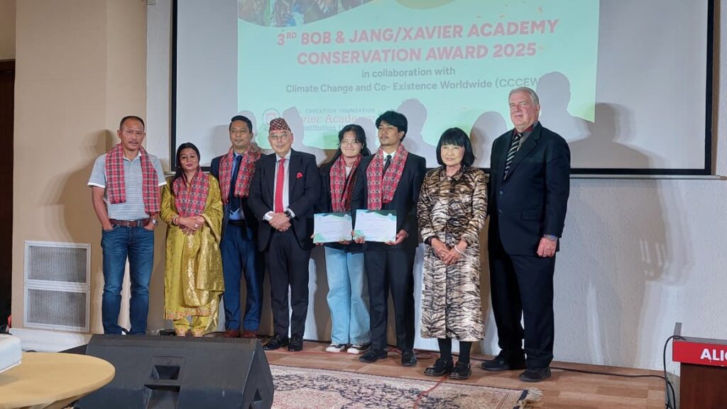 काठमाडौं, असोज २०, २०८२ (अक्टोबर ६, २०२५) — जेभियर एकेडेमी र नेपाल एजुकेशन फाउन्डेशनद्वारा जलवायु परिवर्तन तथा सह–अस्तित्व विश्वव्यापी संस्था (Climate Change and Co-Existence Worldwide – CCCEW) सँगको सहकार्यमा आयोजित तेस्रो बब एन्ड जाङ / जेभियर एकेडेमी कन्जर्भेसन अवार्ड २०२५ उत्साहपूर्वक गैरीधारास्थित एलिस रिसेप्सनमा सम्पन्न भयो। कार्यक्रममा वातावरण संरक्षण, सामुदायिक विकास, र शिक्षामार्फत महिलाको सशक्तिकरणमा योगदान पुर्‍याउने व्यक्तिहरू तथा समूहलाई सम्मान गरिएको थियो।