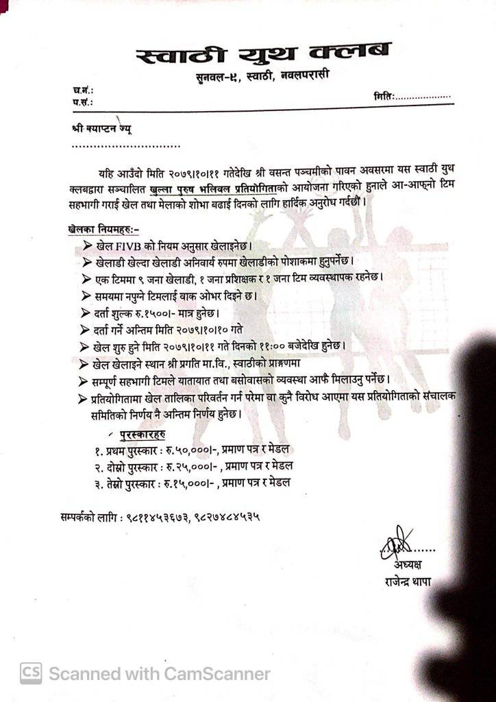 नवलपरासी । पश्चिम नवलपरासीको सुनवल ९ स्वाठी स्थित स्वाठी युथ क्लवको आयोजनामा आउदो माघ ११ गते खुल्ला पुरुष भलिवल प्रतियोगिता सञ्चालन हुने भएको छ । श्री वसन्त पञ्चमीको अवसरमा खुल्ला पुरुष भलिवल प्रतियोगिता सञ्चालन गर्न लागिएको क्लवका अध्यक्ष राजेन्द्र थापाले जानकारी दिनुभयो । प्रतियोगितामा प्रथम हुने समूहलाई ५० हजार, द्धितिय हुने समूहलाई २५ हजार र तृतीय हुने समूहलाई १५ हजार नगद तथा प्रमाण पत्र र मेडल प्रदान गरीने पनि अध्यक्ष थापाले जानकारी दिनुभयो । प्रतियोगितामा सहभागि हुन चाहने समूहलाई तोकिएको प्रक्रिया पुरा गरी आगामी माघ १० गते सम्म टिम दर्ताका लागि समय तोकिएको क्लवले जनाएको छ । प्रतियोगिता प्रगति मावि स्वाठीको प्राङ्गगणमा सञ्चालन हुने छ ।