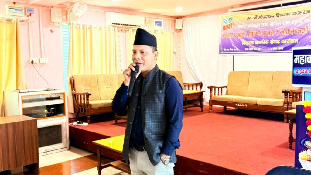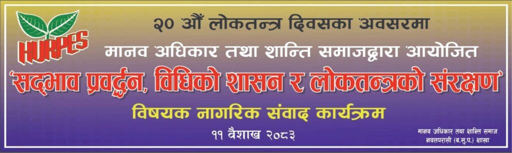 मानव अधिकार तथा शान्ति समाज, नवलपरासी शाखाको आयोजनामा संस्थाका सभापति शिवप्रसाद पौडेलको सभापतित्वमा भएको कार्यक्रममा पौडेलले स्वागत मन्तव्यसहित अवधारणा पत्र प्रस्तुत गर्नुभएको थियो । कार्यक्रममा प्रदेश सभा सदस्य खड्क बस्नेत प्रमुख अतिथिका रूपमा सहभागी रहनुभएको थियो। कार्यक्रमलाई सम्बोधन गर्दै बस्नेतले वर्तमान राजनीतिक अवस्थाप्रति गम्भीर चिन्ता व्यक्त गर्नुभयो। उहाँले लोकतन्त्र केवल व्यवस्था परिवर्तनमा सीमित नभई जनताको जीवनस्तर सुधार, सुशासनको प्रत्याभूति र विकासका प्रतिफल जनतासम्म पुर्याउने माध्यम हुनुपर्ने बताउनुभयो। तर, पछिल्लो समय सरकारहरू जनअपेक्षा अनुसार सञ्चालन हुन नसकेको, राजनीतिक दलहरू जनभावनाबाट टाढिँदै गएको र नेतृत्वमा उत्तरदायित्वको कमी देखिएको उहाँको भनाइ थियो।
