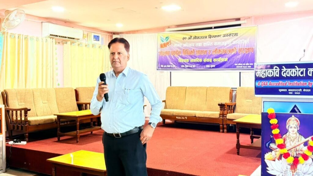 २०औं लोकतन्त्र दिवसको उपलक्ष्यमा महाकवि देवकोटा क्याम्पसको सभा हलमा सद्भाव, प्रर्वद्धन, विधिको सासन र लोकतन्त्रको संरक्षण विषयक नागरिक संवाद कार्यक्रम आयोजना गरिएको छ।