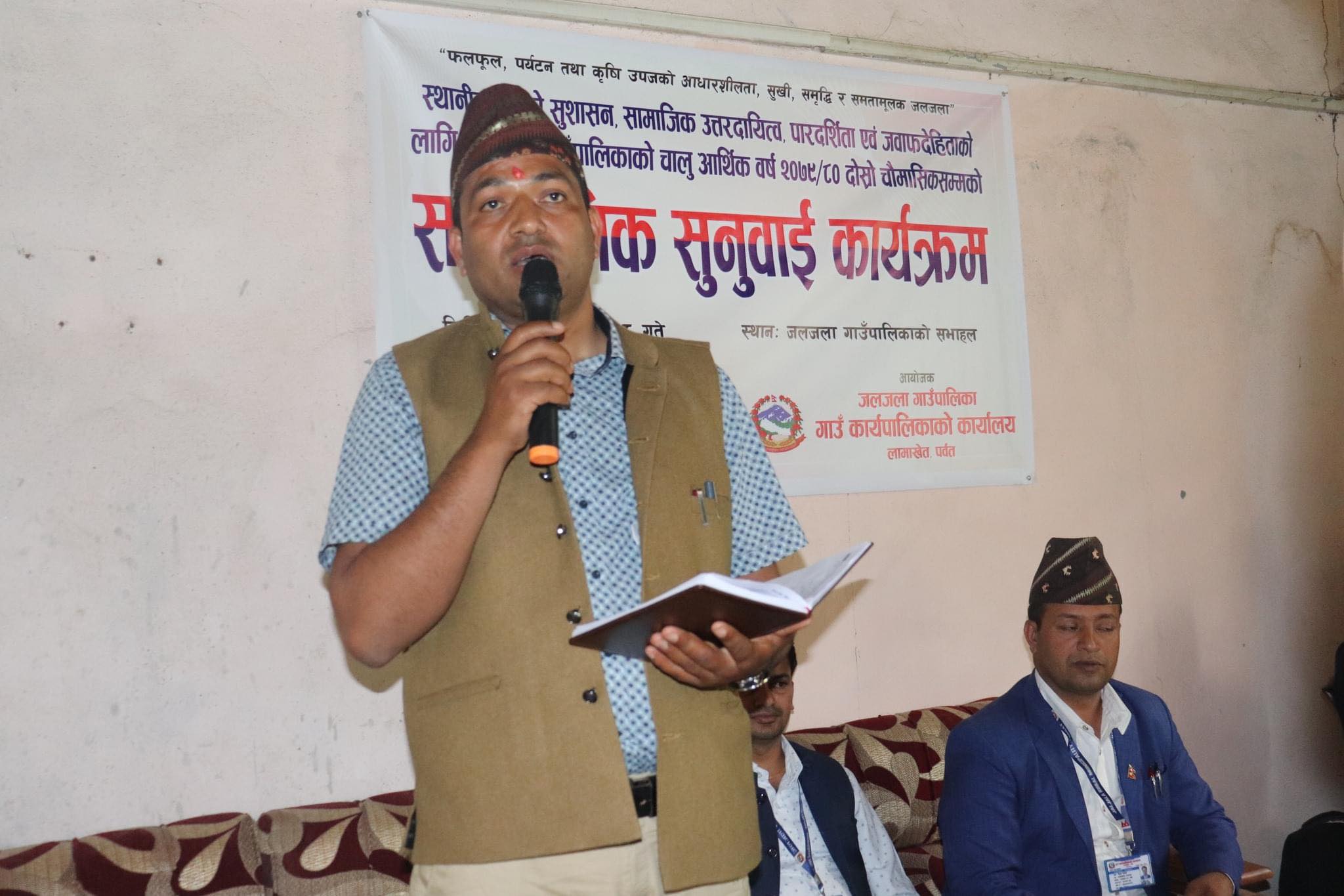 पर्वत । प्रत्येक चौमासिकमा एक पटक पारदर्शिताका लागि सार्वजनिक सुनवाई गर्ने कानुनी प्रावधान रहे पनि धेरै स्थानीय तहहरुले नगरेको पाईरहदा पर्वतको जलजला गाउँपालिकाले भने विधिपुर्वक सार्वजनिक सुनुवाई कार्यक्रम सम्पन्न गरेको छ । गाउँपालिकाले चालू आर्थिक वर्षका प्रगती र आगामी योजनाको बारेमा सार्वजनिक सुनुवाइ गरिएको हो ।