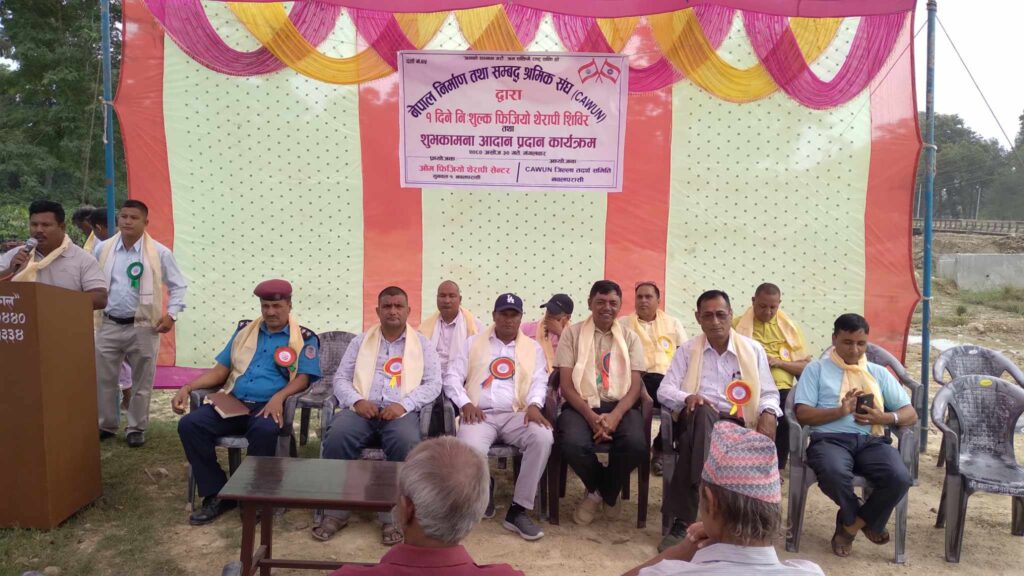 सुनवल । नेपाल निर्माण तथा सम्वद्ध श्रमिक संघ(काउन) जिल्ला तदर्थ समिति नवलपरासीले एक दिने निशुल्क फिजियोथेरापी शिविर एवं शुभकामना आदानप्रदान कार्यक्रम सम्पन्न गरेको छ । नेपाल निर्माण तथा सम्वद्ध श्रमिक संघ जिल्ला तदर्थ समिति नवलपरासीका अध्यक्ष केशवनाथ कवरको अध्यक्षता एवं नेपाली कांग्रेस टे्रड युनियनका जिल्ला अध्यक्ष ज्ञानहरी अर्यालको प्रमुख आतिथ्यतामा कार्यक्रम सम्पन्न भएको हो ।