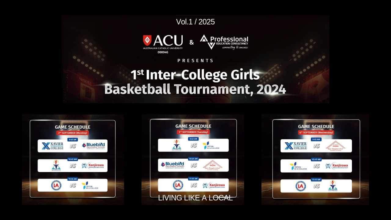 बहुप्रतीक्षित “एसीयू र पिइसी १औं अन्तर-कलेज गर्ल्स बास्केटबल प्रतियोगिता २०२४” सेप्टेम्बर २ देखि ७ सम्म, २०२४ मा ललितपुरको सानो गाउँस्थित रोयल स्पोर्ट्स सेन्ट्रलमा हुँदैछ। यस रोमाञ्चक प्रतियोगितामा जेभियर इन्टरनेशनल कलेज, ब्लु बर्ड्स कलेज, ट्रिटन कलेज, ल्याण्डमार्क एकेडेमी, गोल्डेन गेट इन्टरनेशनल कलेज, रातो बंगला स्कूल, र कान्जिरोवा कलेजजस्ता प्रसिद्ध संस्थाहरूले प्रतिस्पर्धा गर्नेछन्।