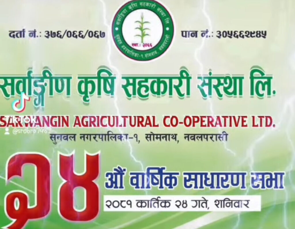 सुनवल / सर्वाङ्गिण कृषि सहकारी सस्था लि सुनवलले ३० करोड ६९ लाख पुजी परिचालन गर्दै २४औं बार्षिक साधारण सभा शनिवार सम्पन्न गरेको छ । खगराज उपाध्यायको अध्यक्षता र नगरपालिकाका उप मेयर सुर्य प्रसाद दुबेको प्रमुख आतिथ्यता एवं संस्था को गणपूरक शेयरधनी सदस्यको उपस्थितिमा सभा सम्पन्न भएको हो ।