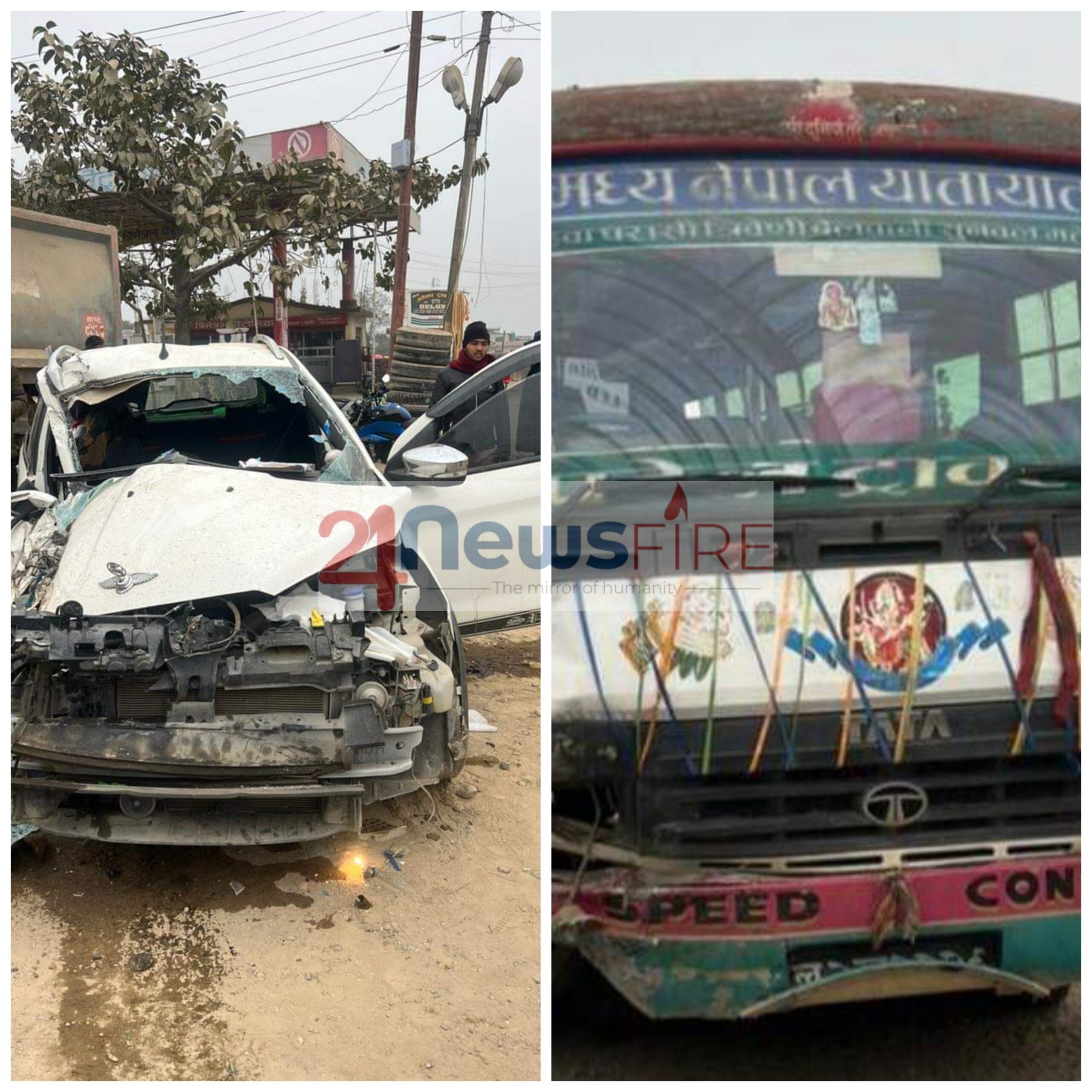 भुमहीमा बस र कार दुर्घटना, कार चालकको मृत्यु, पाँच घाइते